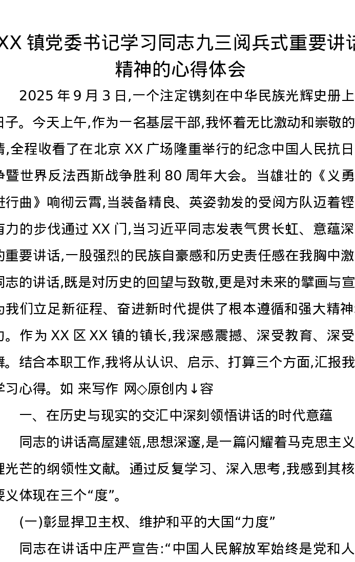 XX镇党委书记学习总书记九三阅兵式重要讲话精神的心得体会
