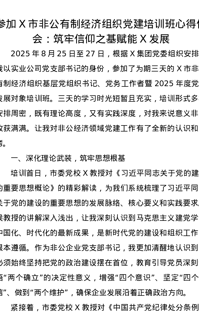 参加X市非公有制经济组织党建培训班心得体会:筑牢信仰之基赋能X发展