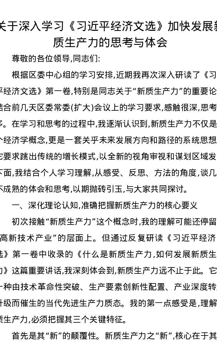 关于深入学习《习近平经济文选》加快发展新质生产力的思考与体会