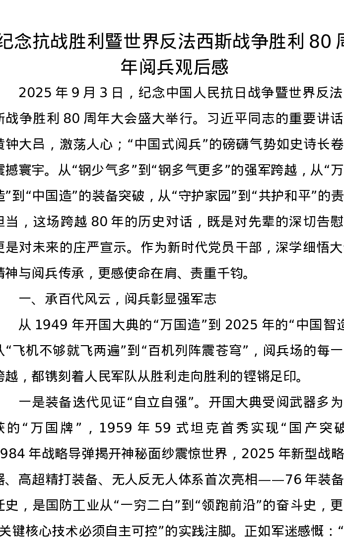 纪念抗战胜利暨世界反法西斯战争胜利80周年阅兵观后感
