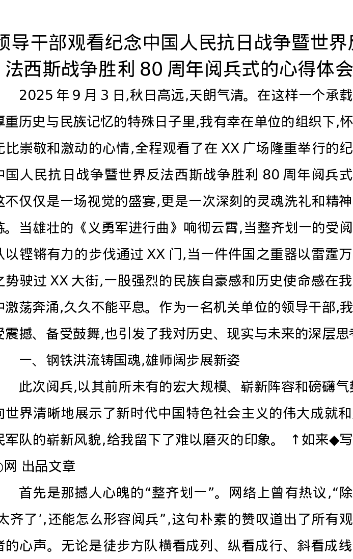 领导干部观看纪念中国人民抗日战争暨世界反法西斯战争胜利80周年阅兵式的心得体会