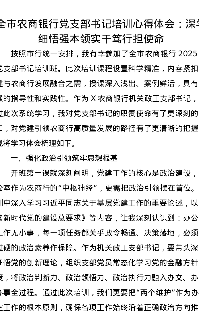 全市农商银行党支部书记培训心得体会:深学细悟强本领实干笃行担使命