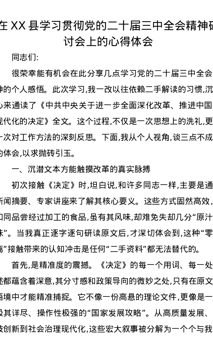 在XX县学习贯彻党的二十届三中全会精神研讨会上的心得体会