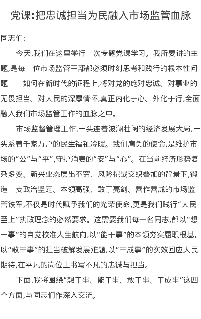 党课讲稿:把忠诚担当为民融入市场监管血脉