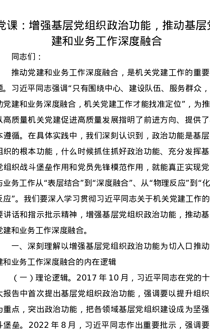 党课讲稿:增强基层党组织政治功能,推动基层党建和业务工作深度融合