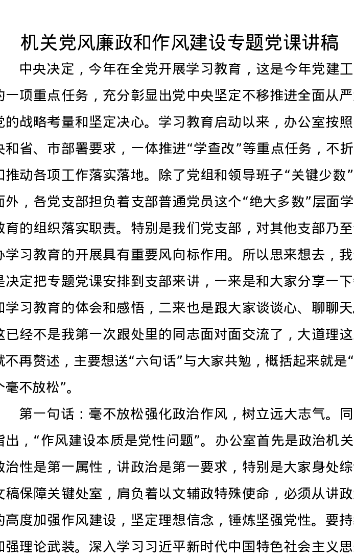 机关党风廉政和作风建设专题党课讲稿
