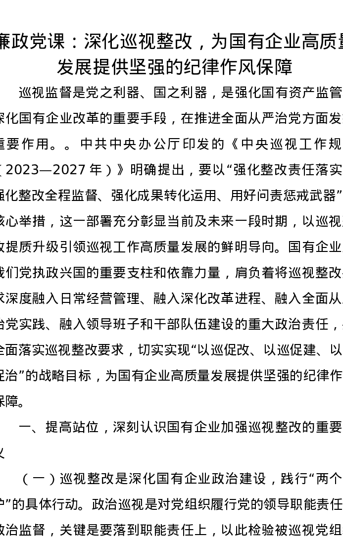 廉政党课讲稿:深化巡视整改,为国有企业高质量发展提供坚强的纪律作风保障
