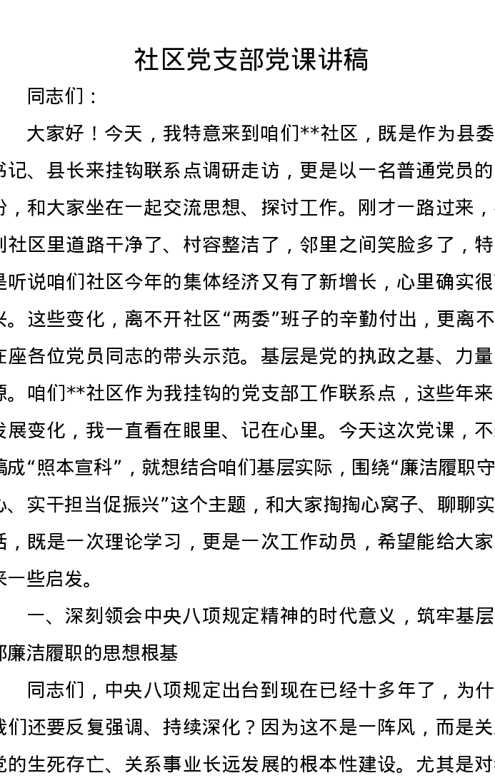 社区党课讲稿:廉洁履职守初心、实干担当促振兴
