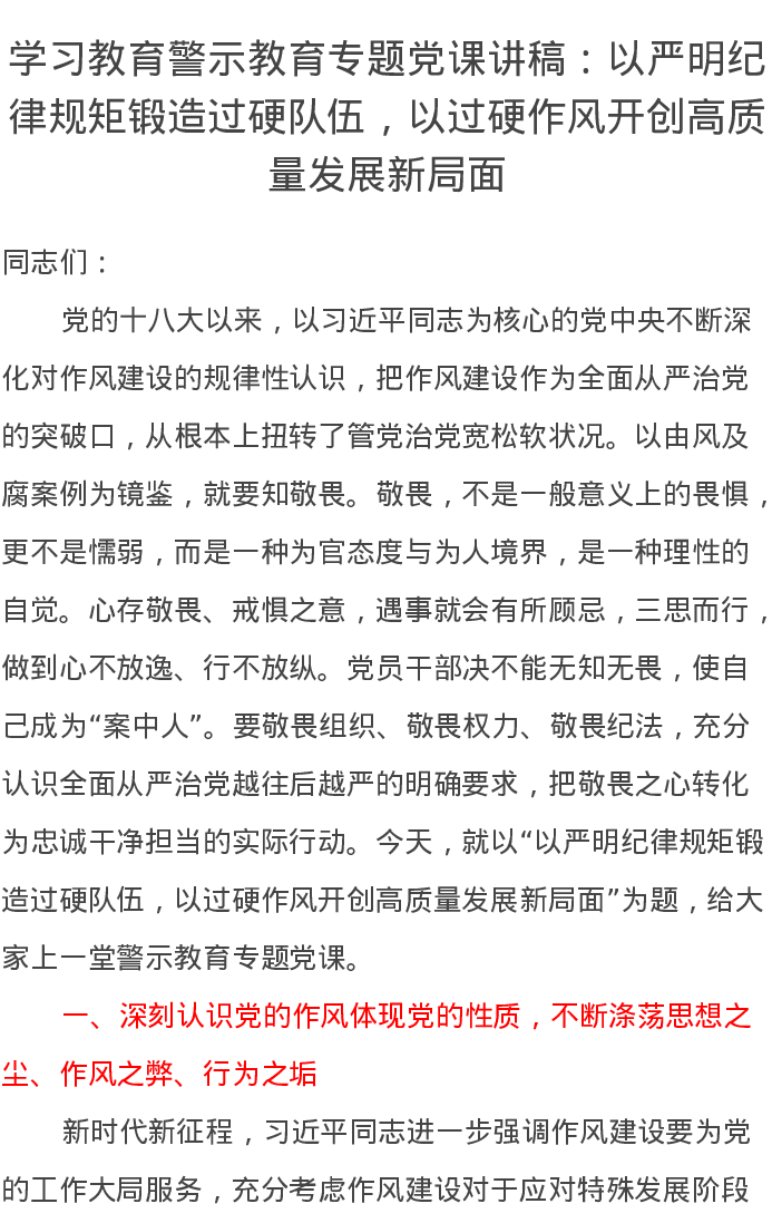 学习教育警示教育专题党课讲稿:以严明纪律规矩锻造过硬队伍,以过硬作风开创高质量发展新局面