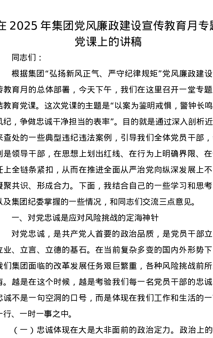 在2025年集团党风廉政建设宣传教育月专题党课上的讲稿