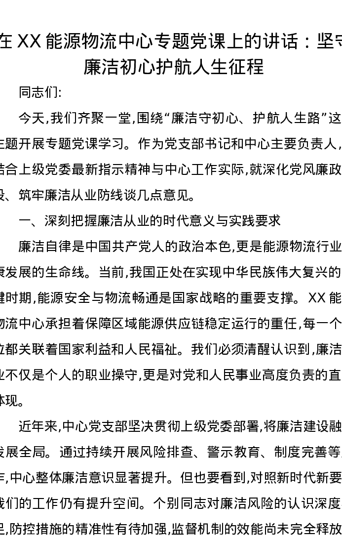 在XX能源物流中心专题党课上的讲话:坚守廉洁初心护航人生征程