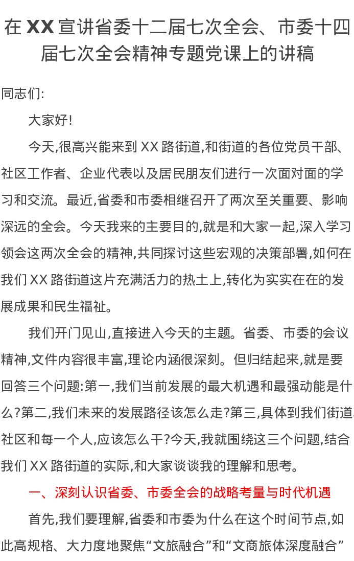 在XX宣讲省委十二届七次全会、市委十四届七次全会精神专题党课上的讲稿