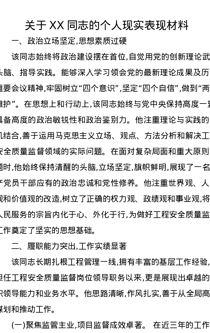 关于XX同志的个人现实表现材料