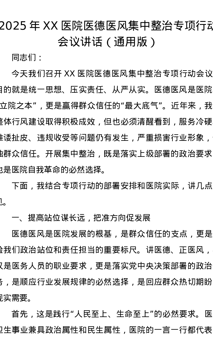 2025年XX医院医德医风集中整治专项行动会议讲话(通用版)