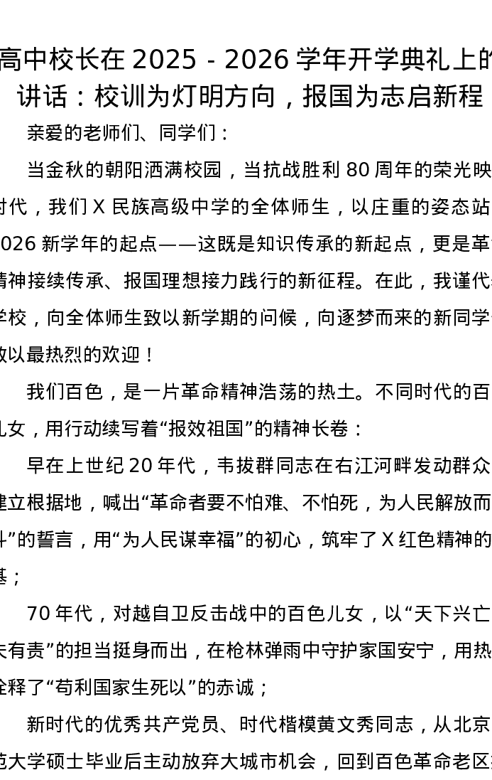 高中校长在2025-2026学年开学典礼上的讲话:校训为灯明方向,报国为志启新程