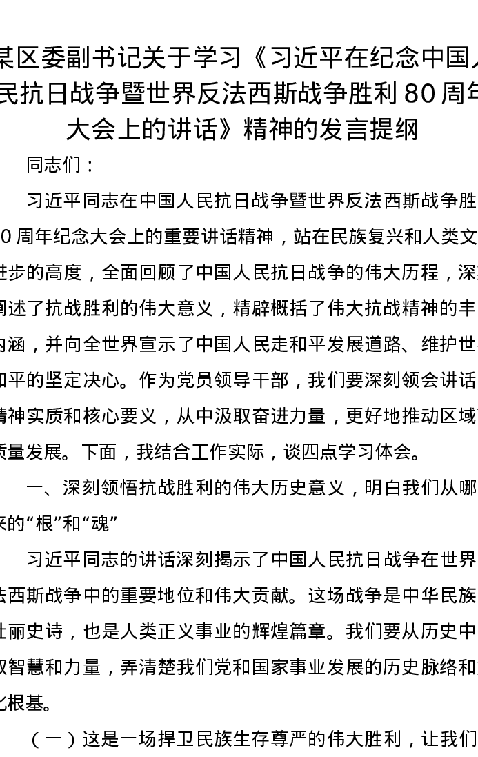 某区委副书记关于学习《习近平在纪念中国人民抗日战争暨世界反法西斯战争胜利80周年大会上的讲话》精神的发言提纲