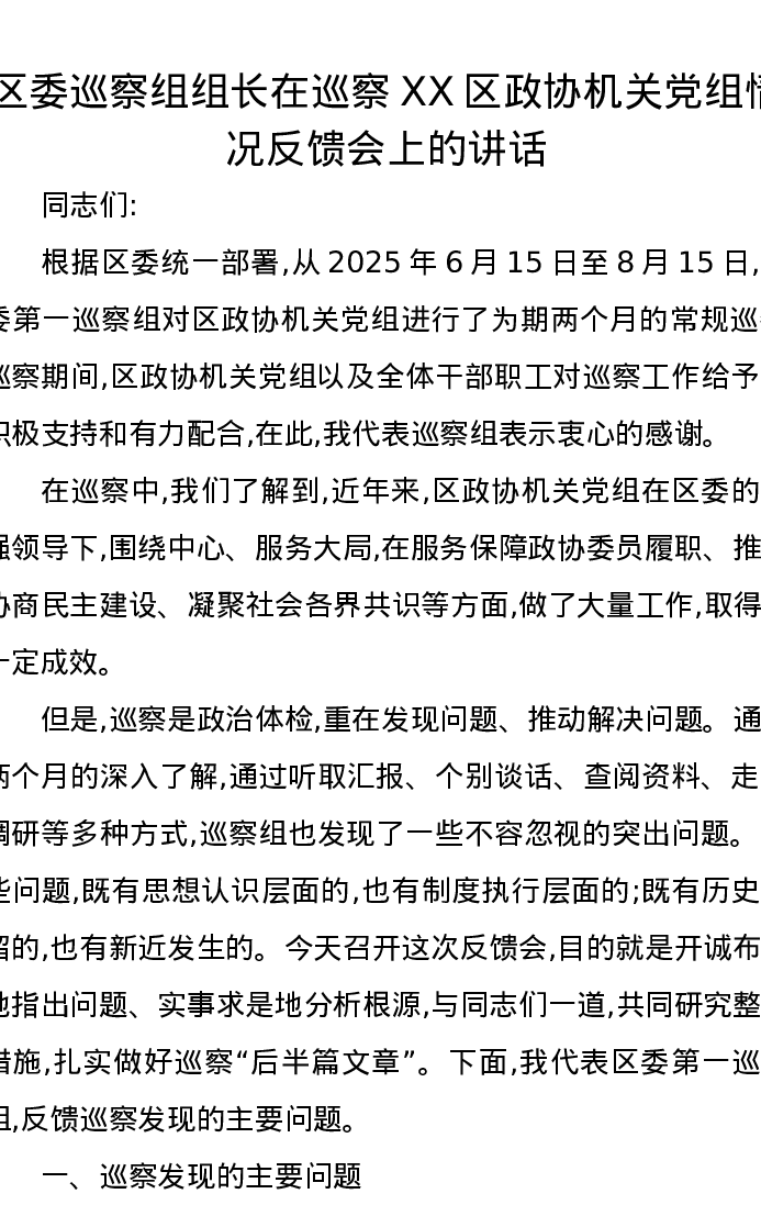 区委巡察组组长在巡察XX区政协机关党组情况反馈会上的讲话