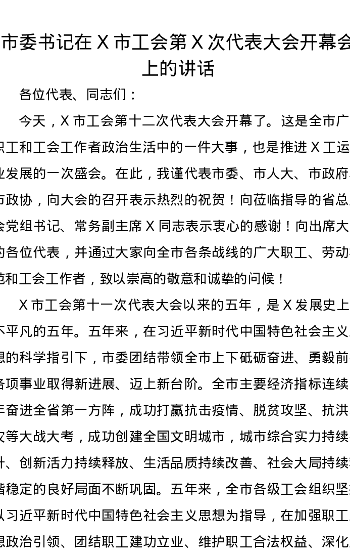 市委书记在X市工会第X次代表大会开幕会上的讲话