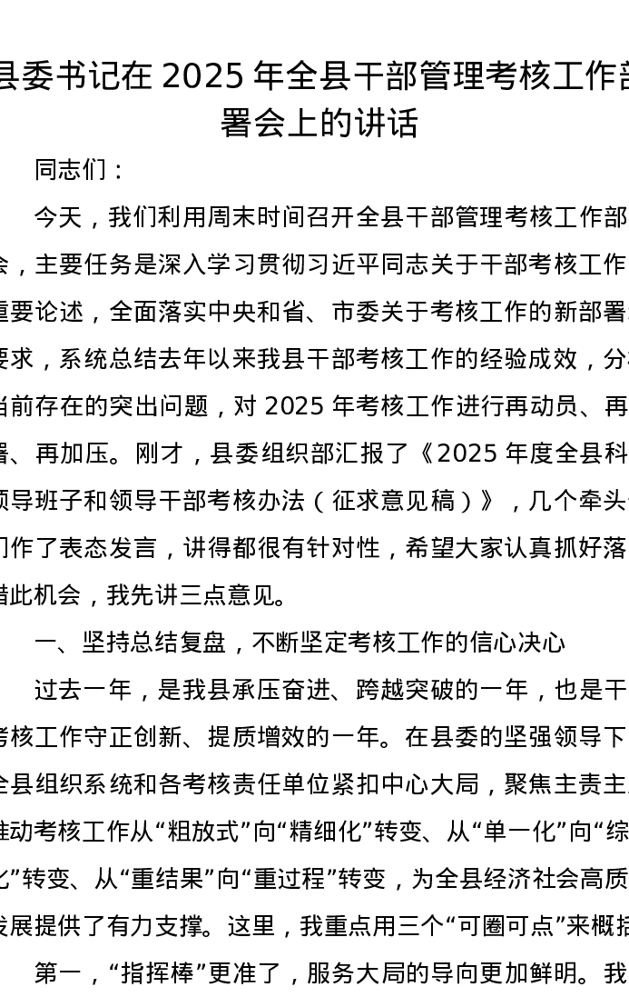 县委书记在2025年全县干部管理考核工作部署会上的讲话
