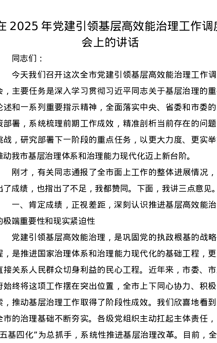 在2025年党建引领基层高效能治理工作调度会上的讲话