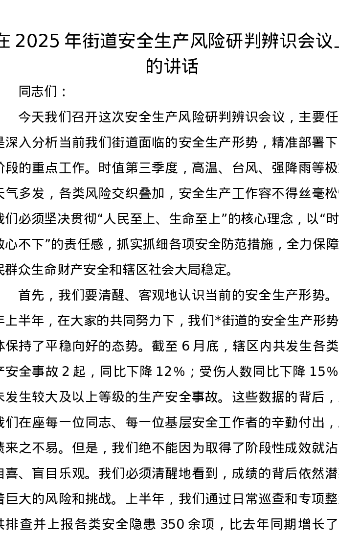 在2025年街道安全生产风险研判辨识会议上的讲话