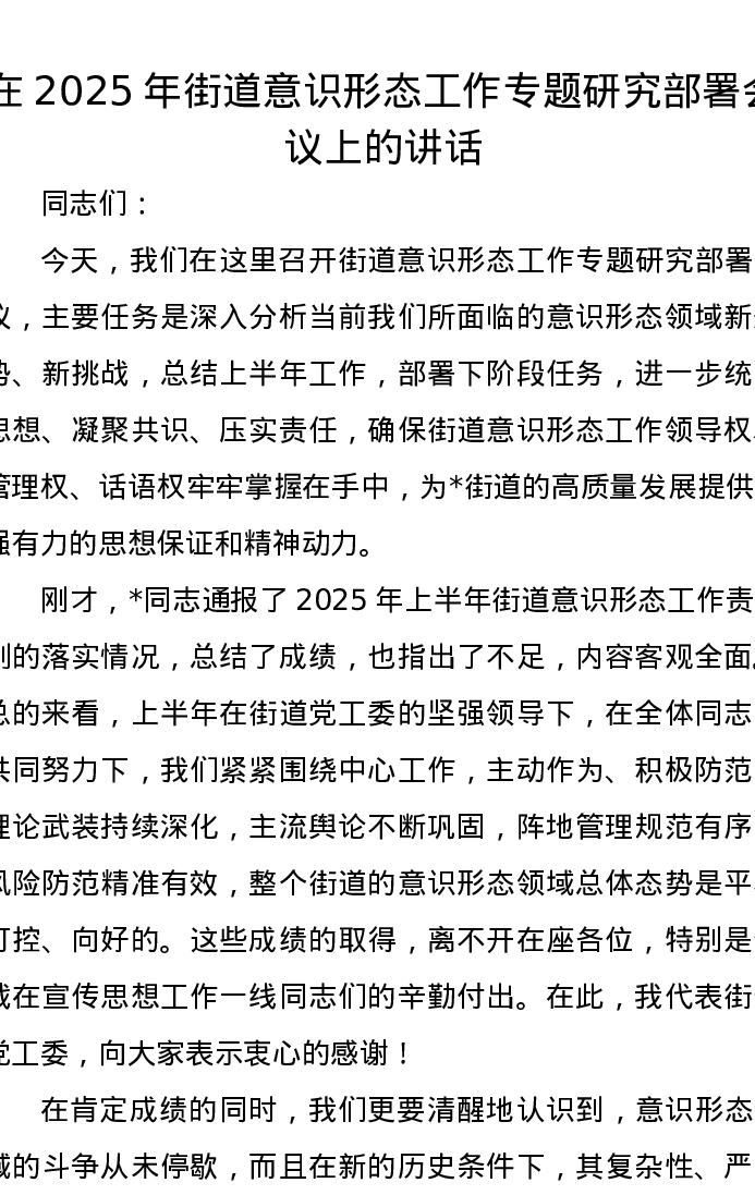 在2025年街道意识形态工作专题研究部署会议上的讲话