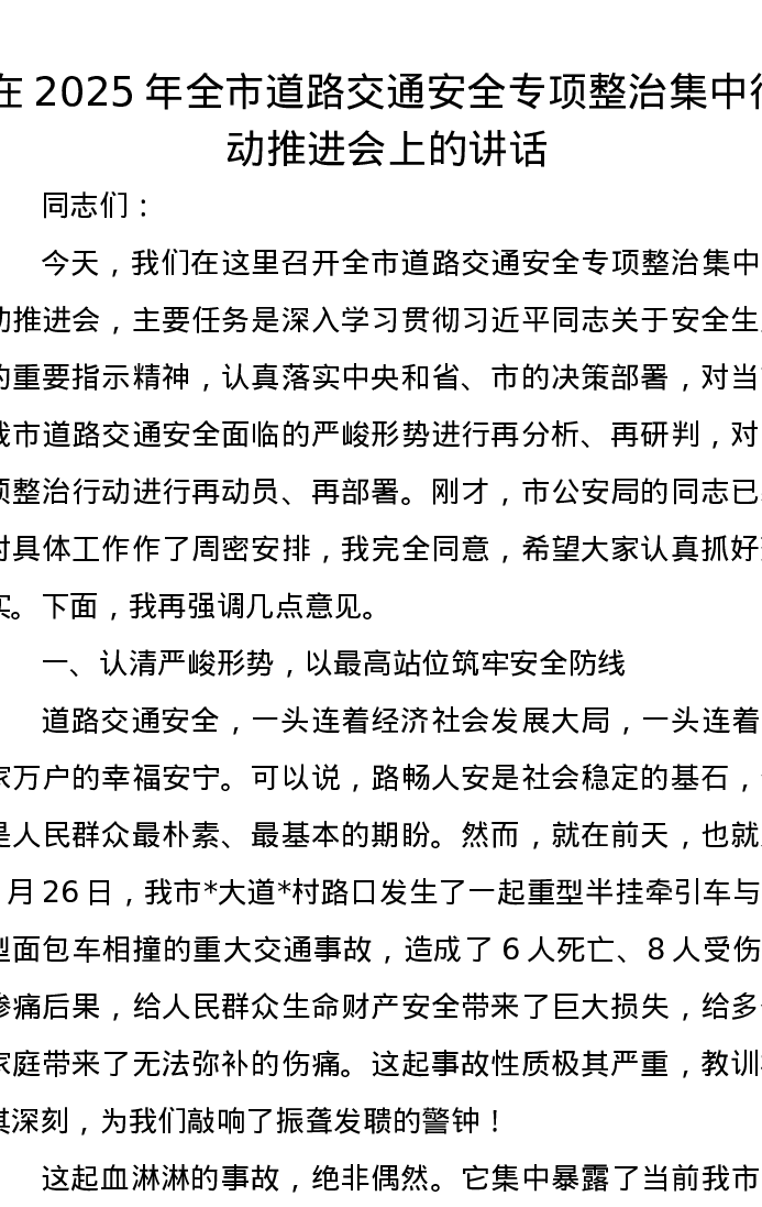 在2025年全市道路交通安全专项整治集中行动推进会上的讲话