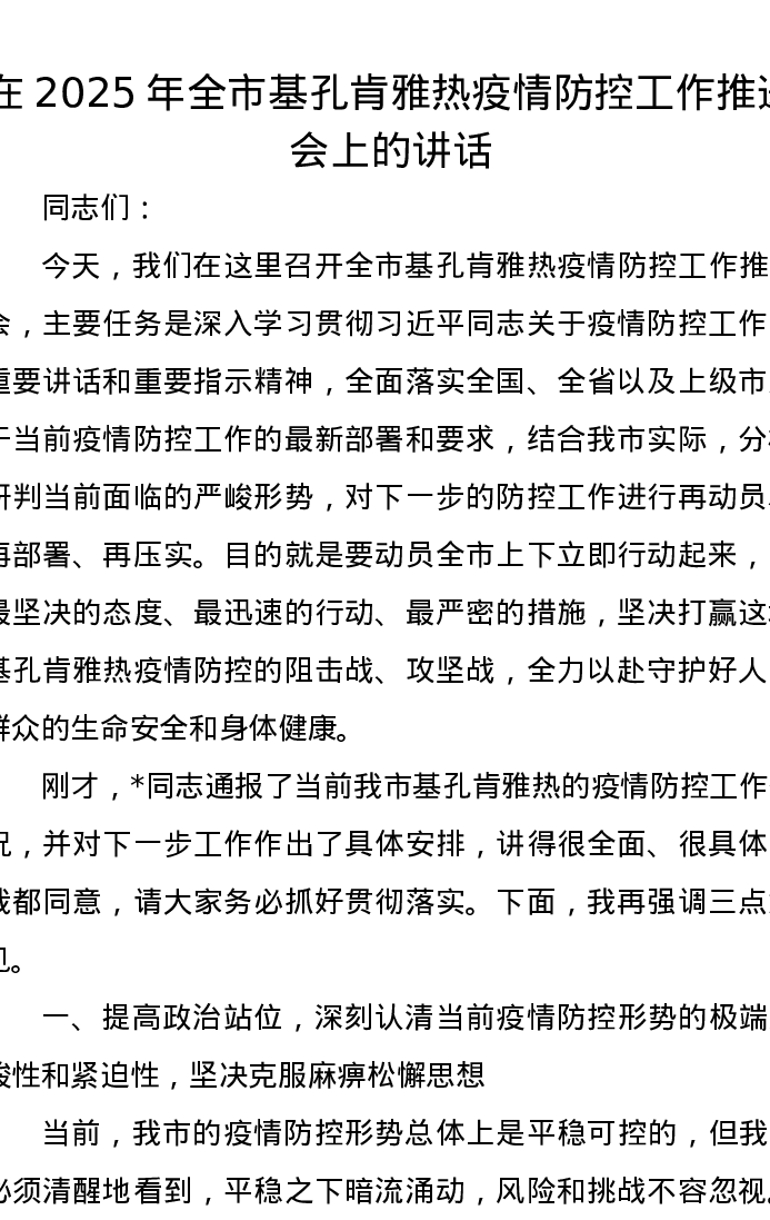 在2025年全市基孔肯雅热疫情防控工作推进会上的讲话