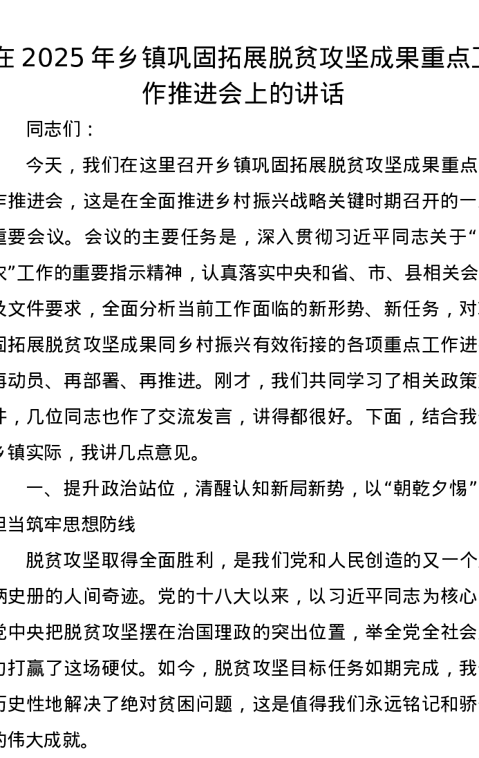 在2025年乡镇巩固拓展脱贫攻坚成果重点工作推进会上的讲话