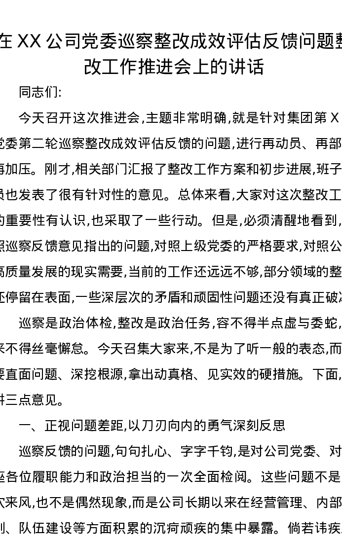 在XX公司党委巡察整改成效评估反馈问题整改工作推进会上的讲话
