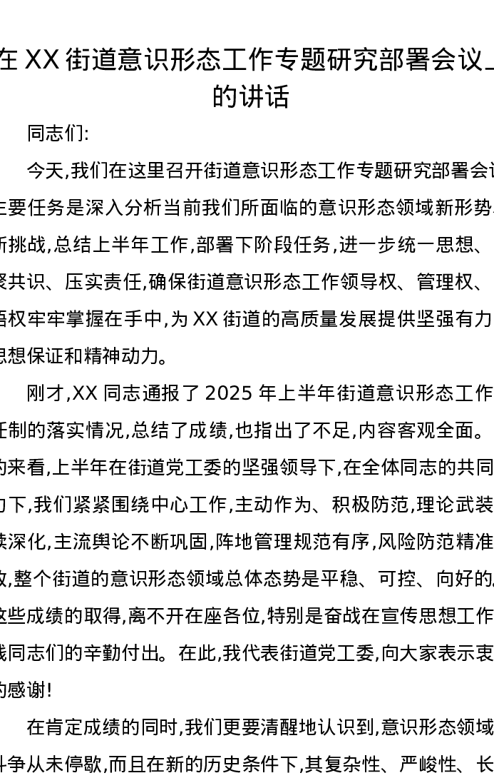 在XX街道意识形态工作专题研究部署会议上的讲话