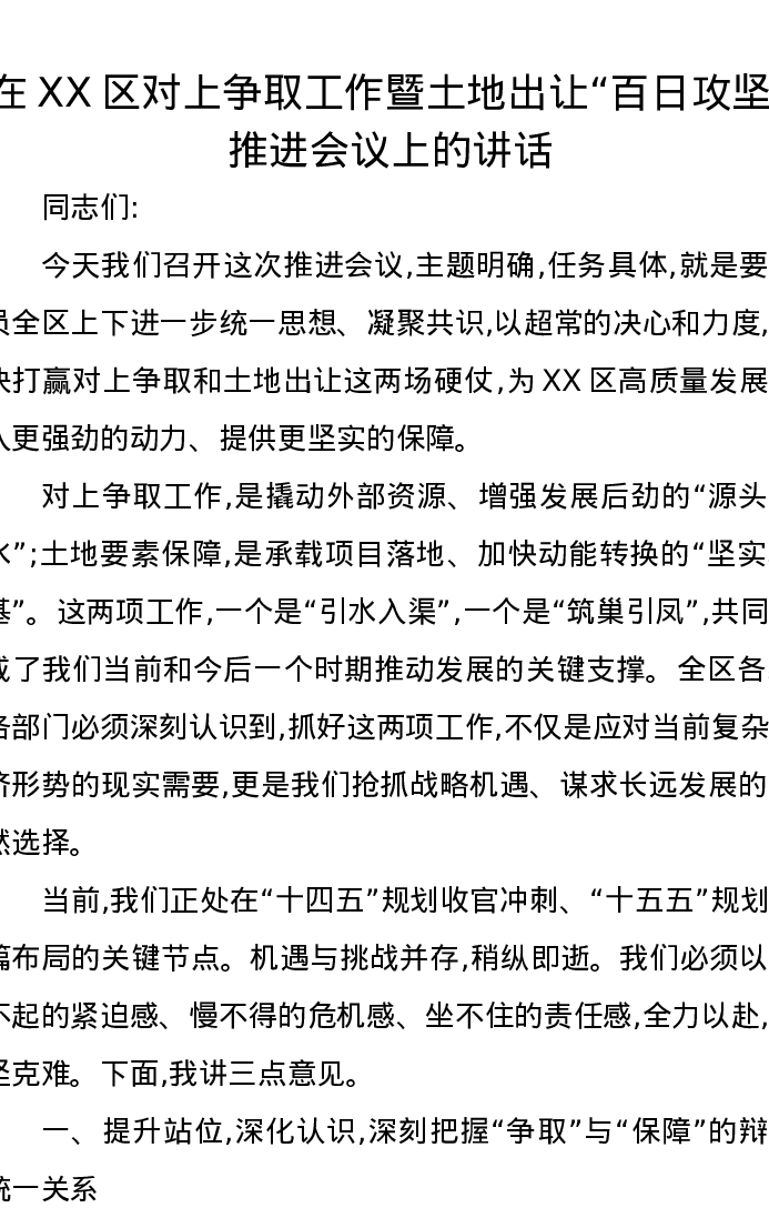 在XX区对上争取工作暨土地出让“百日攻坚”推进会议上的讲话