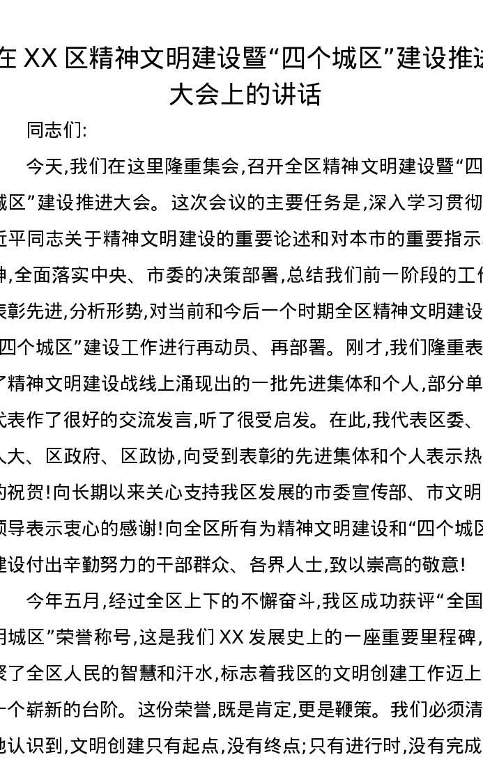 在XX区精神文明建设暨“四个城区”建设推进大会上的讲话