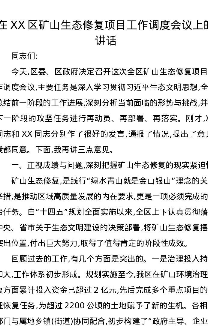 在XX区矿山生态修复项目工作调度会议上的讲话