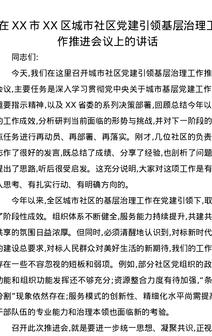 在XX市XX区城市社区党建引领基层治理工作推进会议上的讲话