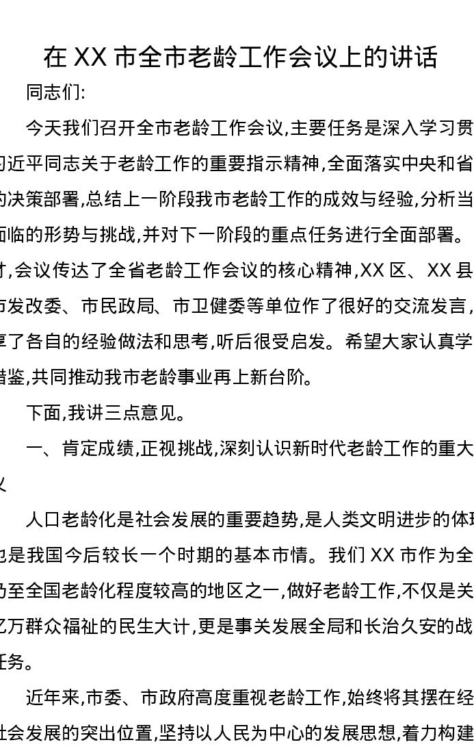 在XX市全市老龄工作会议上的讲话