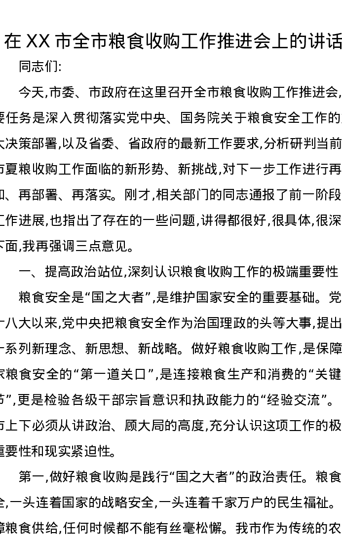 在XX市全市粮食收购工作推进会上的讲话