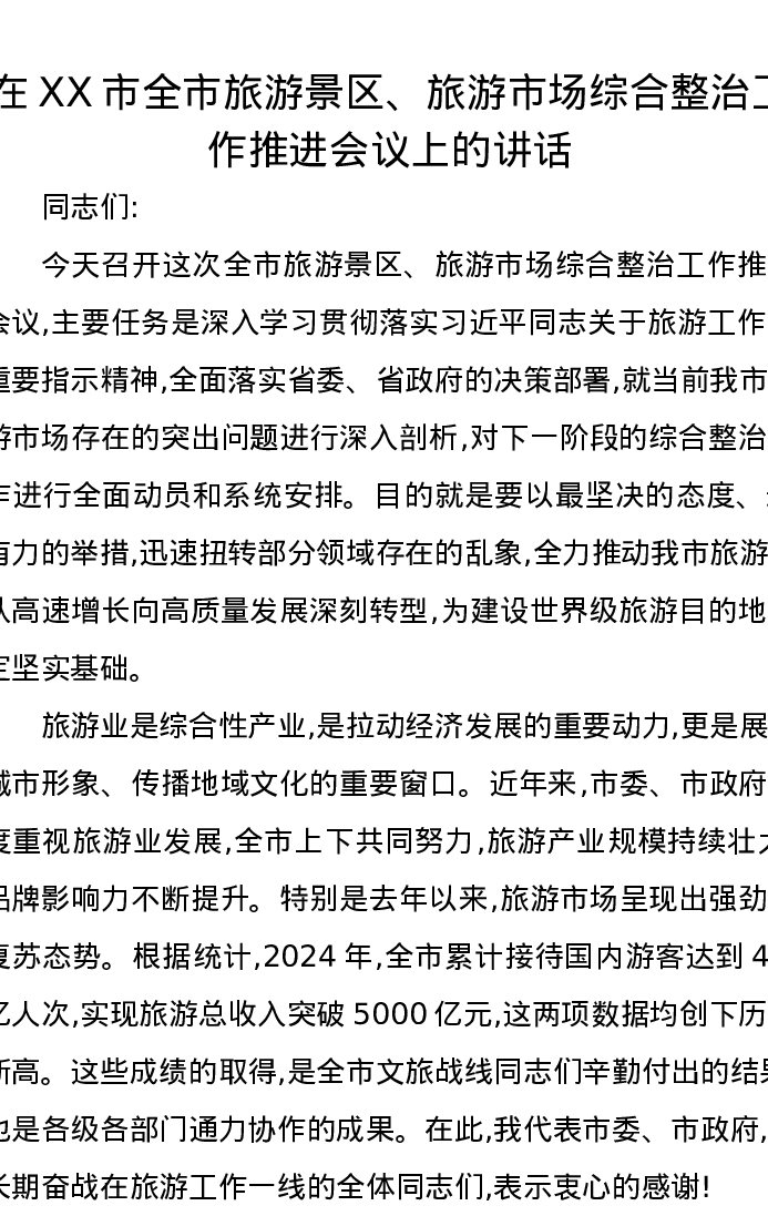 在XX市全市旅游景区、旅游市场综合整治工作推进会议上的讲话