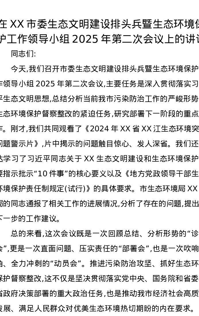 在XX市委生态文明建设排头兵暨生态环境保护工作领导小组2025年第二次会议上的讲话