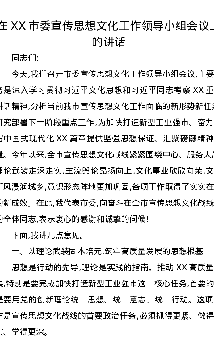在XX市委宣传思想文化工作领导小组会议上的讲话
