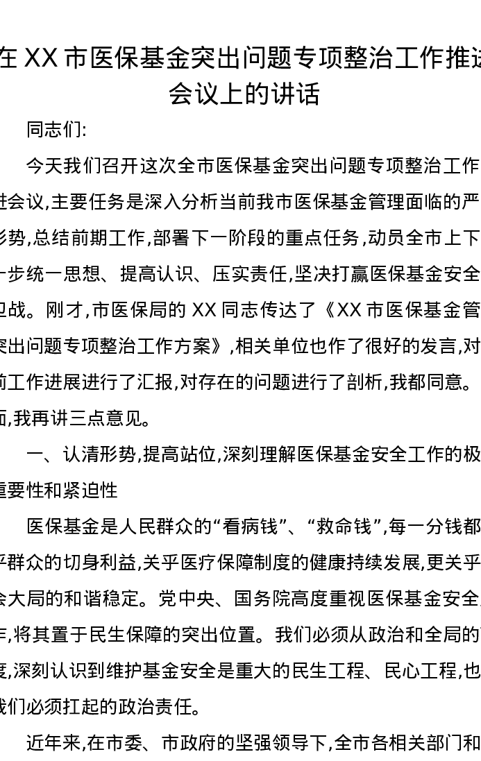 在XX市医保基金突出问题专项整治工作推进会议上的讲话