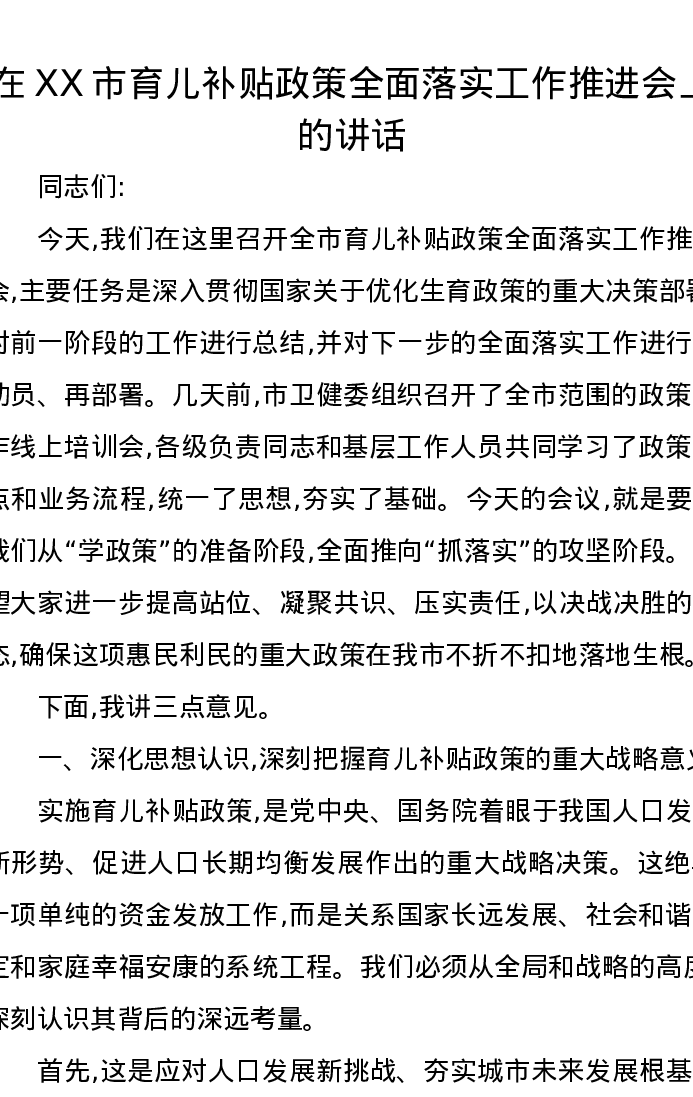 在XX市育儿补贴政策全面落实工作推进会上的讲话