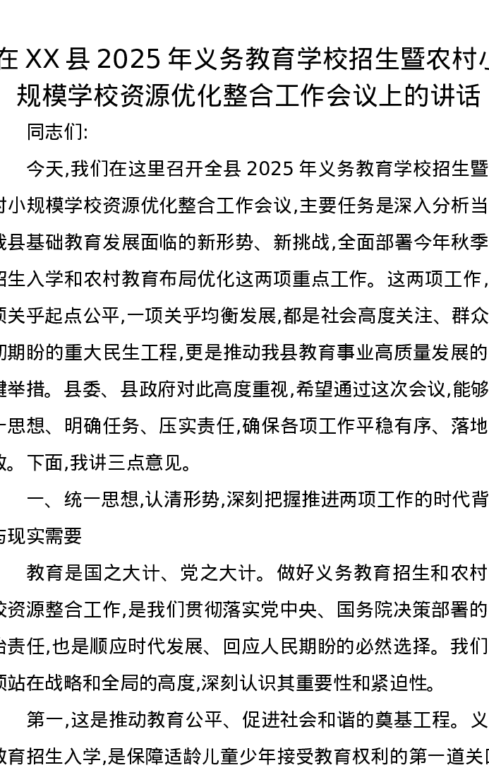 在XX县2025年义务教育学校招生暨农村小规模学校资源优化整合工作会议上的讲话