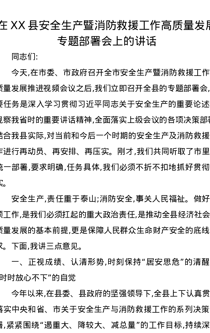 在XX县安全生产暨消防救援工作高质量发展专题部署会上的讲话