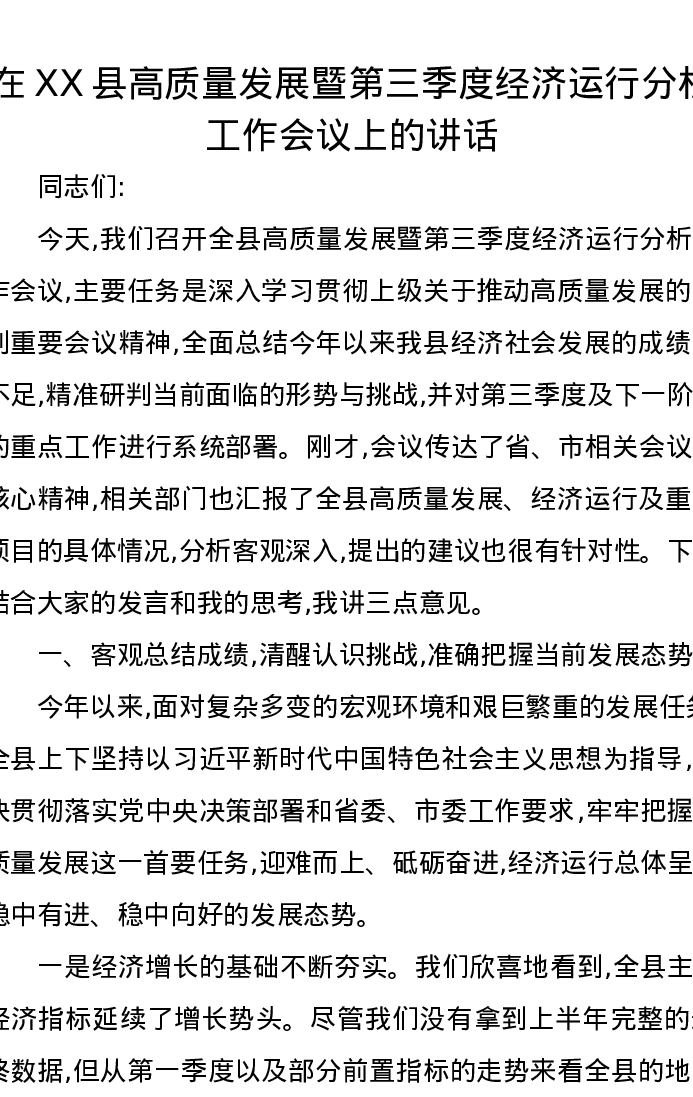 在XX县高质量发展暨第三季度经济运行分析工作会议上的讲话