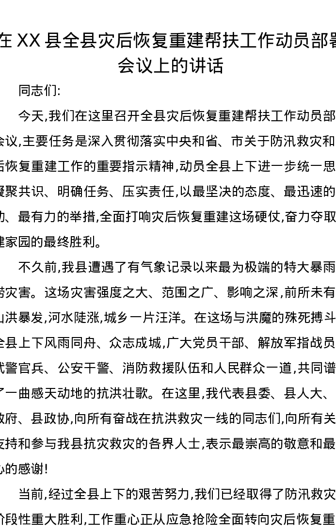 在XX县全县灾后恢复重建帮扶工作动员部署会议上的讲话