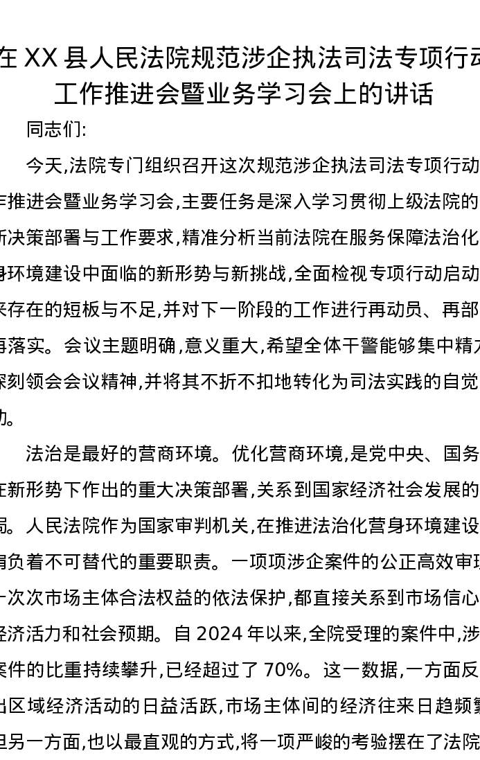 在XX县人民法院规范涉企执法司法专项行动工作推进会暨业务学习会上的讲话