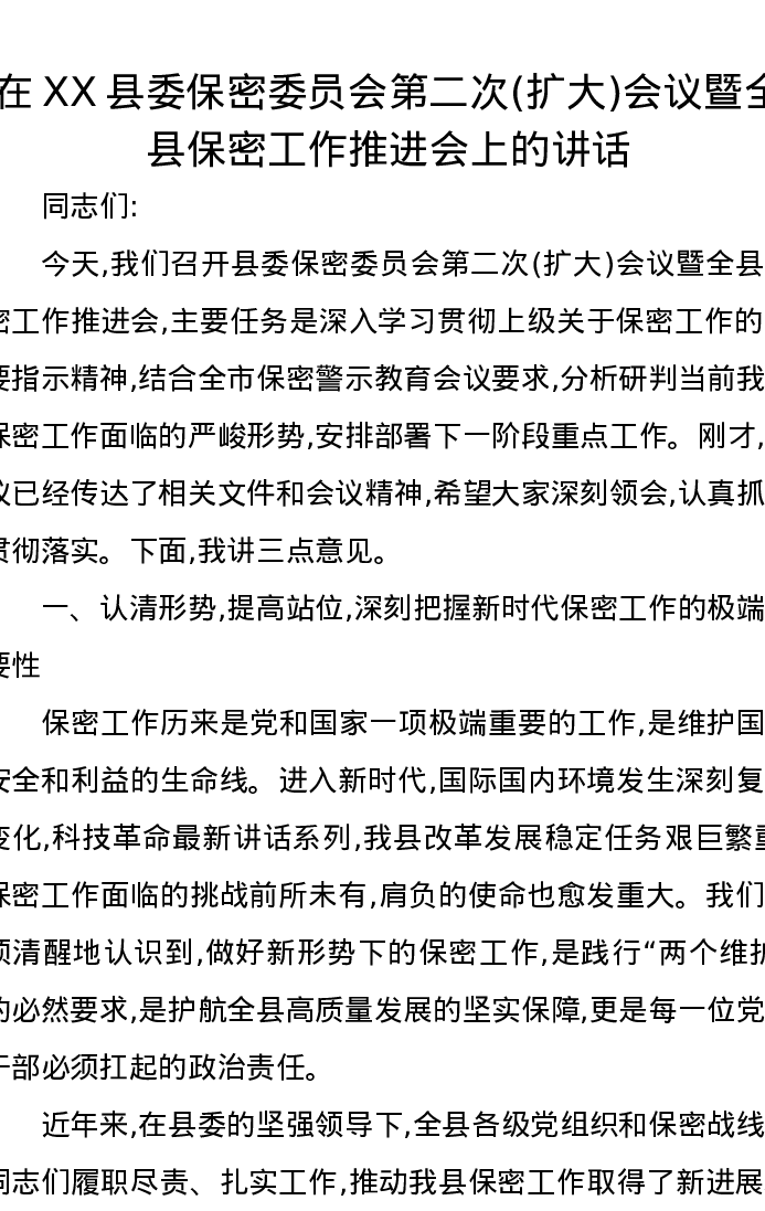在XX县委保密委员会第二次(扩大)会议暨全县保密工作推进会上的讲话
