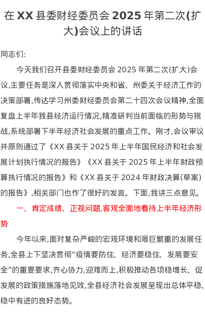 在XX县委财经委员会2025年第二次(扩大)会议上的讲话