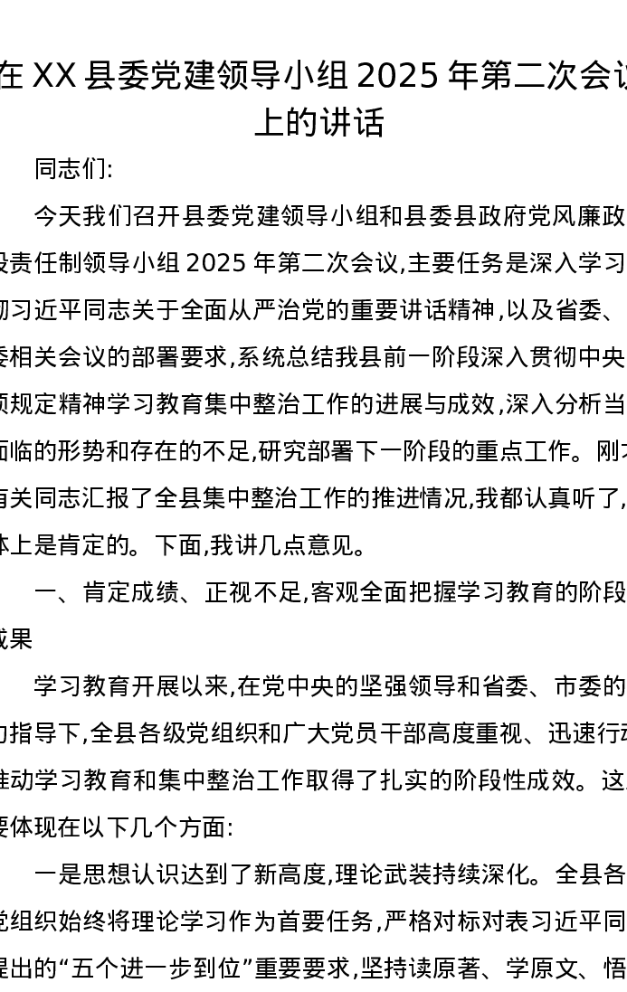 在XX县委党建领导小组2025年第二次会议上的讲话